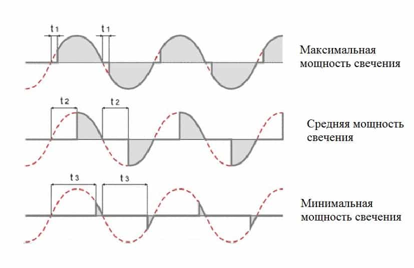 Как видите, такая схема диммера осуществляет регулировку яркости «обрезая» форму синусоиды до определенного импульса, уменьшая и величину напряжения, и его действующее значение. В виду нестабильного колебания кривой такую модель светорегулятора однозначно можно подключать к лампам накаливания, поскольку они не восприимчивы к форме напряжения. Что касается светодиодных и люминесцентных моделей, их нужно тестировать на уже готовом диммере.