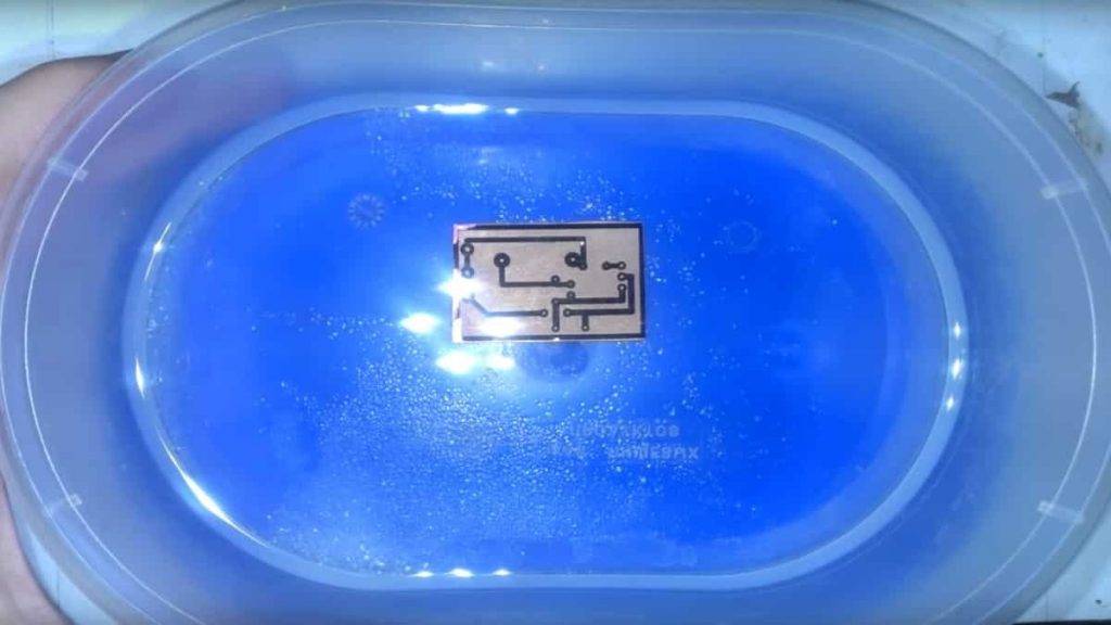 - Далее плату необходимо протравить. Приготовьте раствор хлорного железа. Посуду возьмите такую, чтобы плата не ложилась плотно на дно, а своими уголками как бы упиралась о её стенки. Во время травления переворачивайте плату периодически и помешивайте раствор. В случае, когда это надо сделать быстро, согрейте раствор до температуры 50-60 градусов.