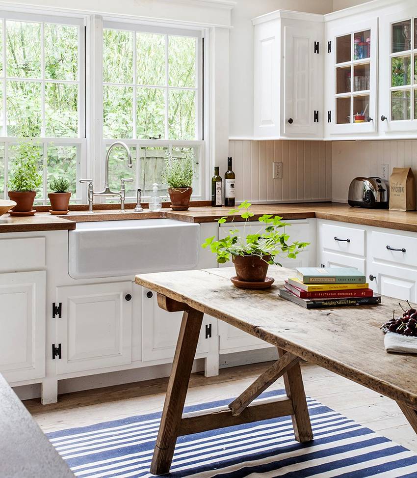 Несколько вариантов оформления светлой кухоньки с деревянной рабочей столешницей: