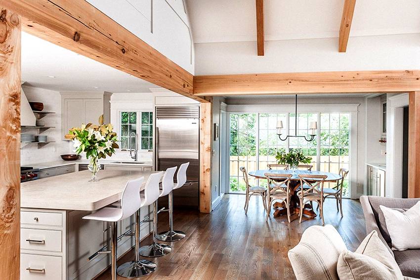 Кухни со светлым деревом, сделанные со вкусом, создадут ощущение свежести и гармонии. Самый популярный вариант такого типа оформления – это сочетание белого гарнитура со столешницей, фартуком и полом из дерева. Такая бело-деревянная кухня довольно просторная и имеет стильный внешний вид. На кухне загородного дома уместны потолочные балки из дерева, гармонирующие с полом, что соответствует спокойному и умиротворенному горному стилю шале.