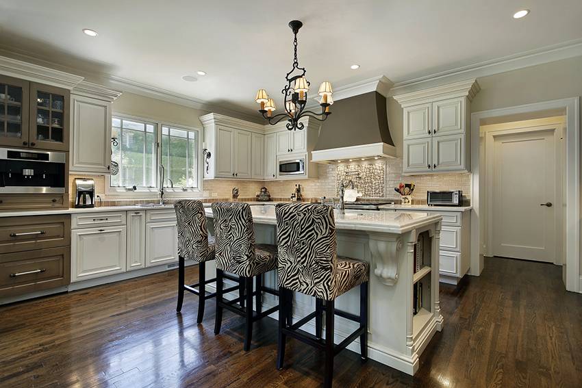 Независимо от выбранного материала, нужно с особой внимательностью отнестись к цвету дерева. Теплоты и уюта белому интерьеру придадут насыщенные медовые и коньячные тона дуба или бука. Светлый цвет древесины ясеня или беленого дуба на фоне белых шкафов будет выглядеть менее выразительно, а слишком темная поверхность может создать излишний контраст. Поддержать его можно за счет других акцентов в том же тоне. Это может быть покрытие пола или мебель обеденной зоны. Для слишком темного помещения лучше выбрать древесину теплого золотистого цвета.