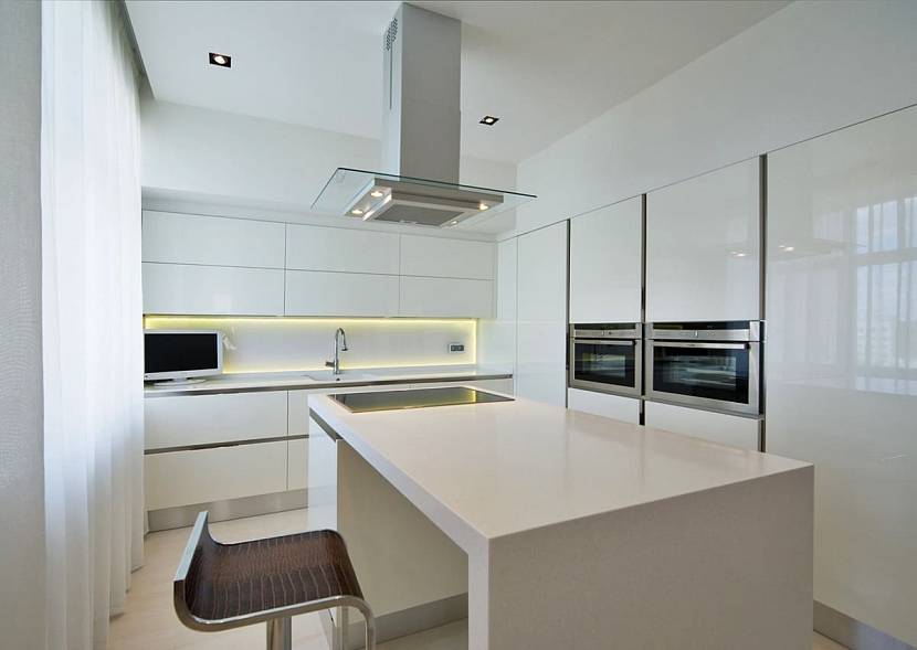 - Белоснежные глянцевые поверхности. Они визуально увеличивают пространство. Следы от капель и налета на них практически незаметны.