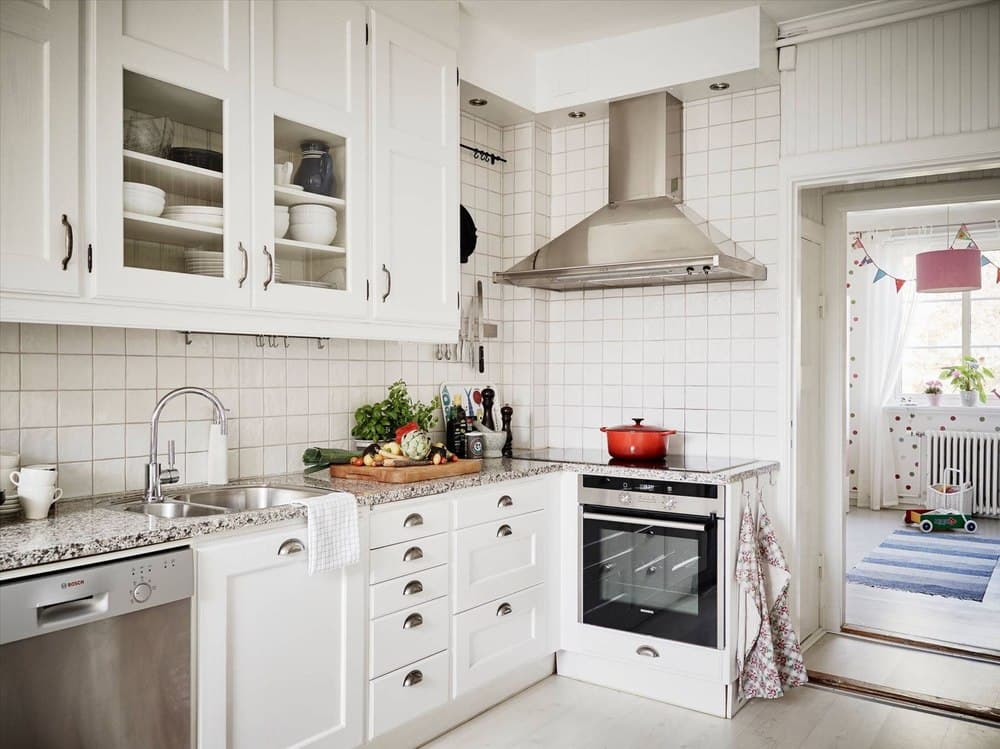 Эталон: белый потолок, гладкие светлые поверхности, белоснежный или яркий фартук и пол под выбеленное дерево или плитку. Функциональная мебель и изобилие освещения – это то, что придает кухне особый уют и тепло.