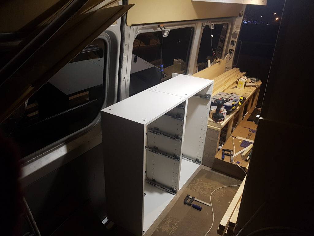 Прямо в кузове сваривается каркас для мебели. Если выставить ровно автомобиль нельзя, можно использовать в качестве уровня трубу, упертую концами в нижний край оконных проемов. После черновой сварки каркас вынимается и все сваривается, зачищается и опять заносится внутрь.