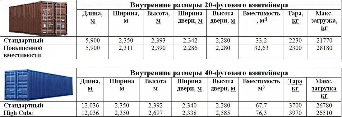 Стандартный 40-ка футовый грузовой морской контейнер имеет следующие внутренние габариты: