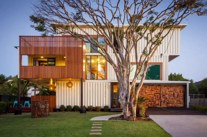 Прочность морских контейнеров позволяет устанавливать их один на другой. Таким образом получают объект с большой жилой площадью, занимающий минимум места на участке.