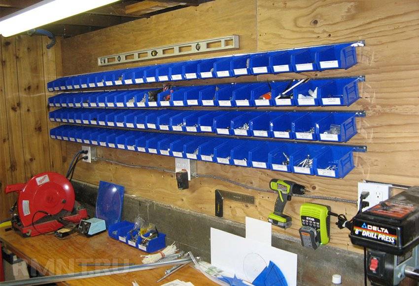 1. В первую очередь стоит позаботиться о мелочах: гвоздях, шурупах, болтах, которые имеют свойство теряться и рассыпаться по всему помещению. Для их хранения можно приспособить обычные пластиковые бутылки с обрезанными горлышками — сразу будет видно, что где лежит. Подойдут и небольшие пластиковые коробки, которые лучше подписать, отметив, что здесь, например, лежат гвозди такого-то размера. Такие ёмкости для хранения мелочей удобно расставить на полке над рабочим столом, чтобы не загромождать его. А вот стеклянные банки использовать в мастерской не стоит. Здесь слишком много тяжёлых металлических предметов, которыми можно невзначай задеть такую хрупкую ёмкость.