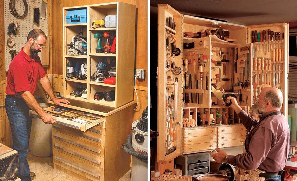 Для частой эксплуатации подходят открытые модели. При создании шкафа стоит оборудовать его выдвижными ящиками. На дверцах и боковых стенках можно установить крепления для всевозможных орудий, аппаратов, электроинструментов.