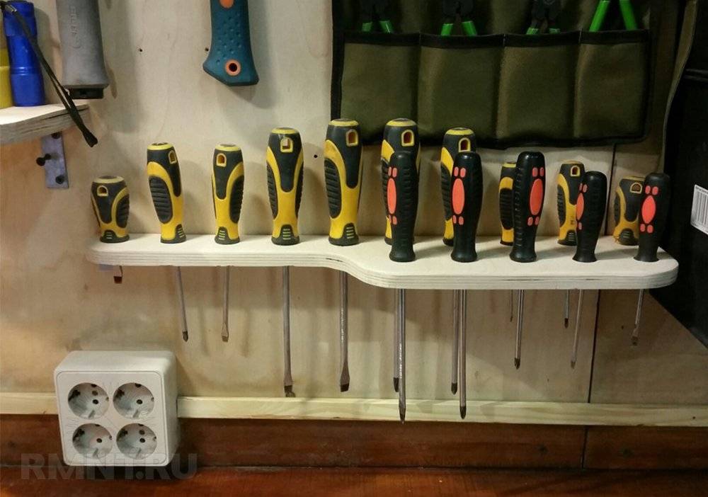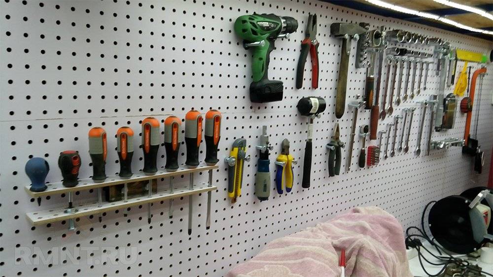 . На них закрепляют отвертки, гаечные ключи, плоскогубцы. Чтобы сделать щит для инструмента в гараже своими руками, используют массив доски и прочные крючки. Комплектация зависит от собственных предпочтений мастера.