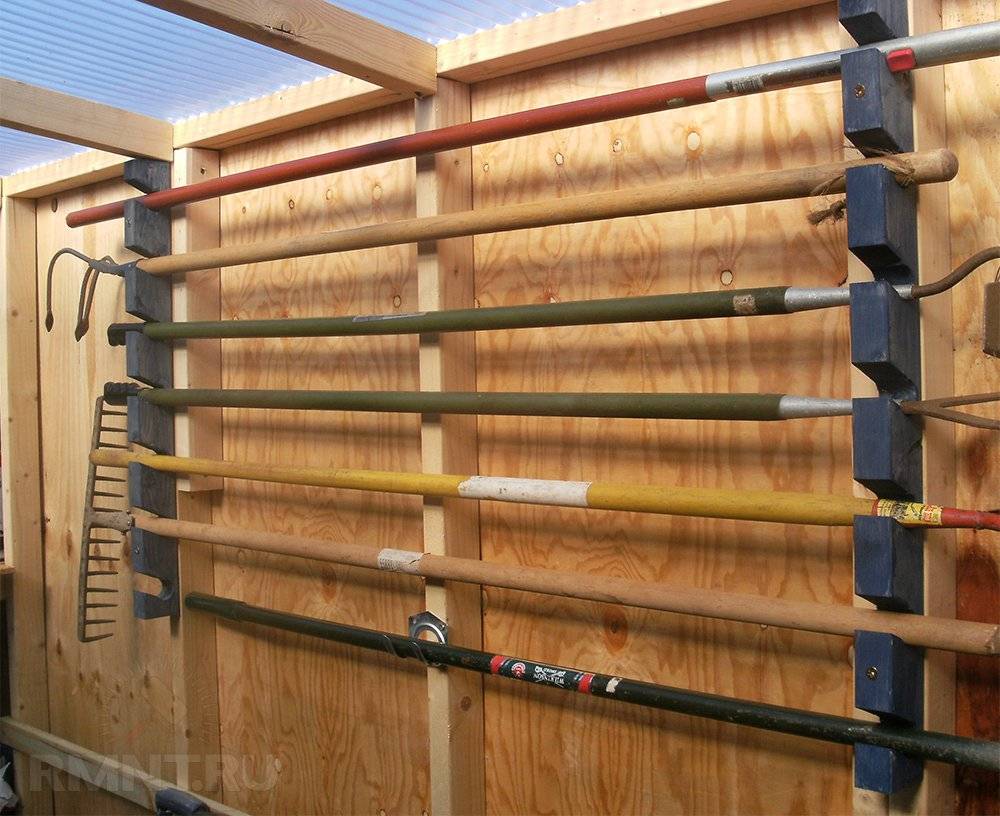 10. Для садового ручного инструмента отлично подойдёт отдельно стоящий стеллаж с держателями для длинных ручек лопат и тяпок. Конечно, вы можете просто прислонять их к стене, но ведь помните пословицу про те же грабли?