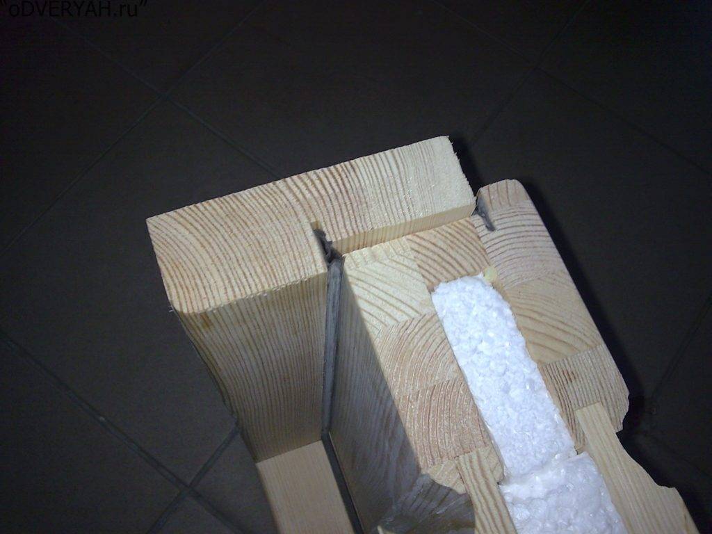 Вначале, согласно размерам необходимо сделать коробку двери. Боковая часть будет изготавливаться в точности с высотой. Согласно размерам, отрезаем брус. Теперь его нужно зафиксировать, чтобы узнать длину поперечных балок. Один человек устанавливает их, второй измеряет. От готовой ширины коробки, необходимо отнять по 5 см с каждой стороны, на монтажный проем. Затем собираем коробку. Если есть возможность, то на углах выпиливается шиповое соединение. Если нет, то каждый угол, фиксируют двумя соморезами.