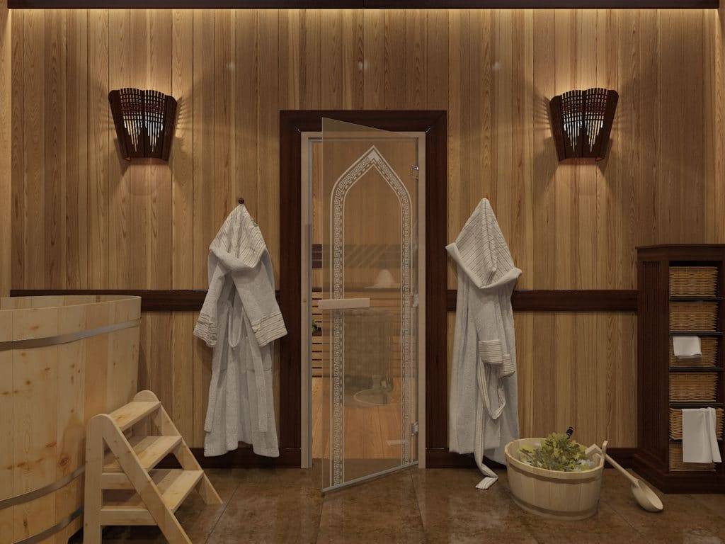 Стеклянные двери — это всегда выигрышное декоративное решение, так как они придают бане современный и стильный вид. Также она хорошо сохраняет температуру в парной: когда внутрення сторона полотна нагревается до 80оС, внешняя остаётся тёплой на ощупь (около 40оС). К тому же стеклянная дверь — это дополнительный источник естественного света в небольшой тесной парной/душевой, где не всегда есть отдельное окно.