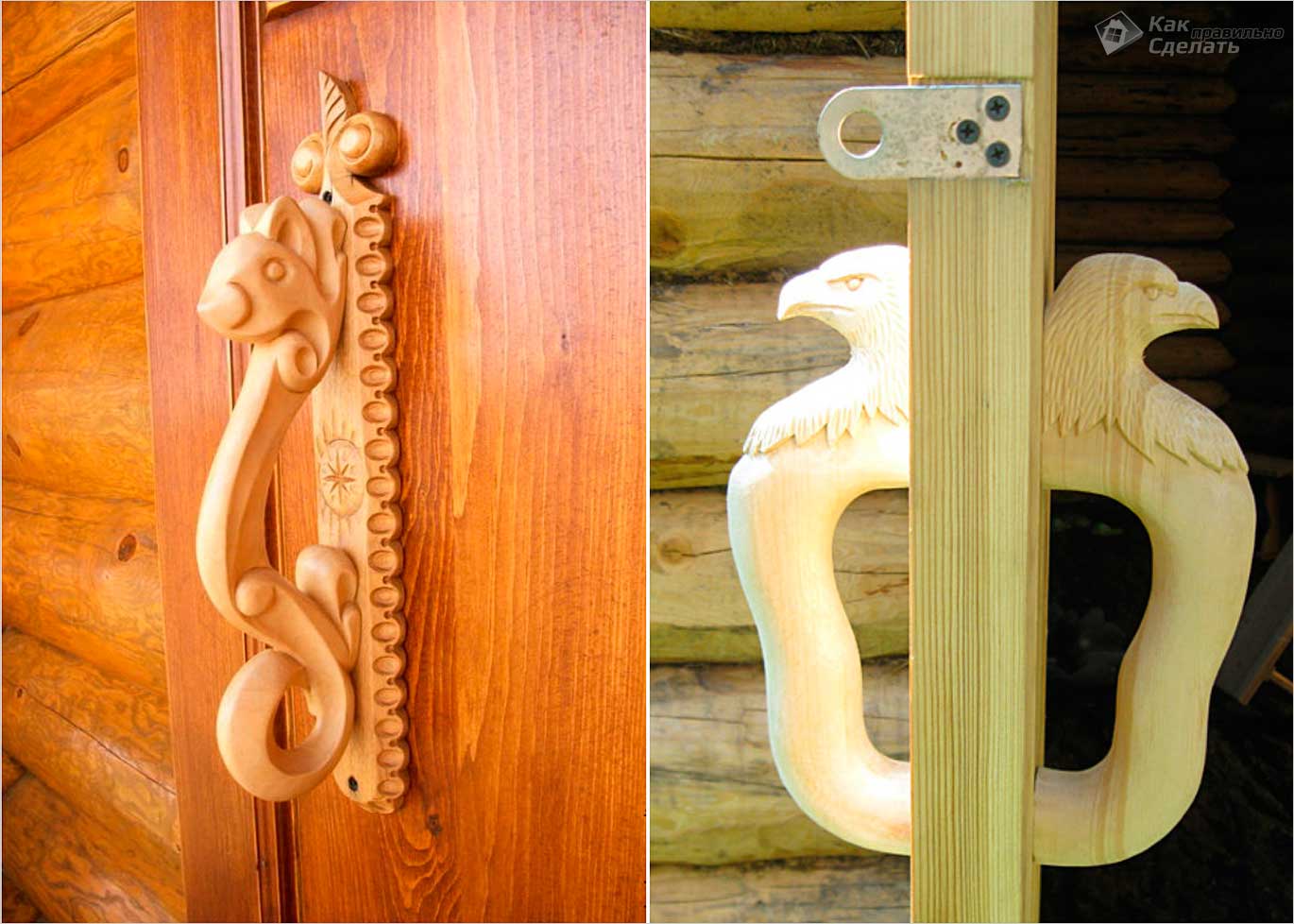 Вторым дополнительным элементом фурнитуры есть дверная ручка. Серьёзным нюансом при выборе данного элемента есть тот фактор, чтобы изделие не грелось, а исходя из этого для него используют дерево. При жажде, ручку может быть сделать своими руками, или приобрести. Изделие из дерева может быть поменять пластмассовым, но не рекомендуется использовать металлическую фурнитуру.