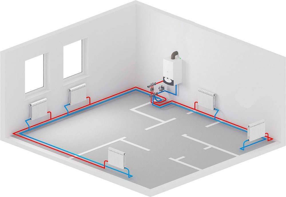 В отличие от одноконтурной системы, две трубы рассчитаны на подачу и на возврат теплоносителя. Такая разводка часто используется в новостройках и обеспечивает равномерный обогрев всех комнат.