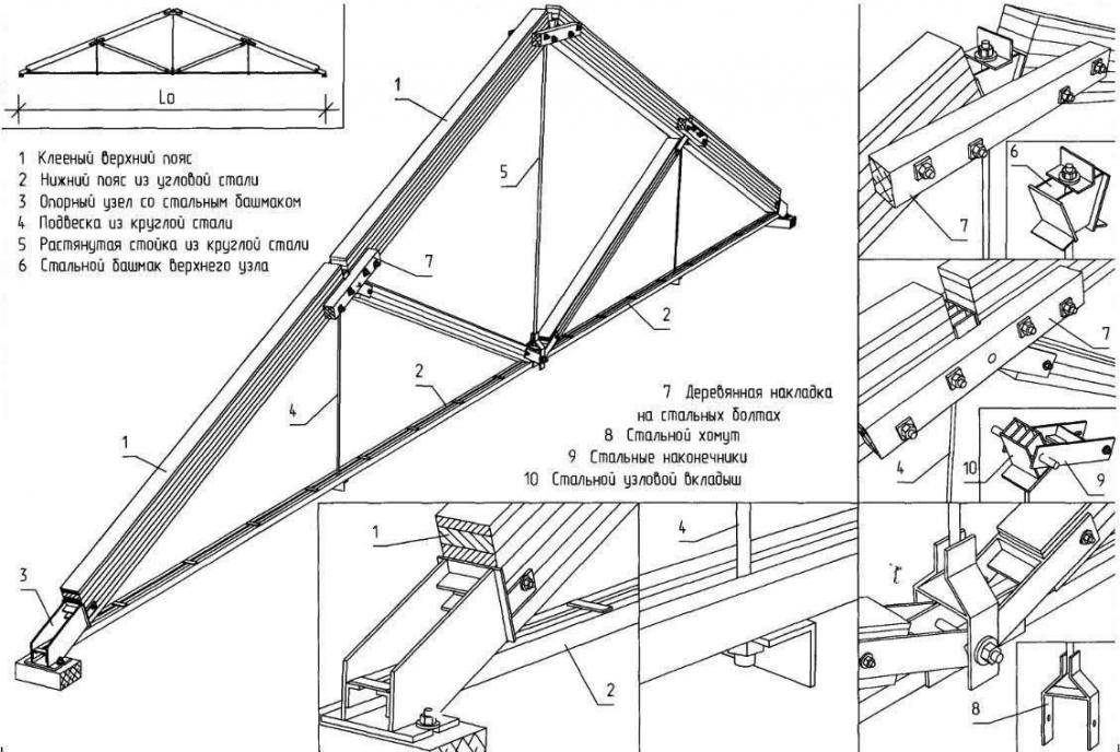 Ферму висячего типа вполне можно собрать на земле, а затем подать наверх для монтажа, о чем подробно рассказывается в соответствующей статье. Но без грузоподъемных приспособлений вдвоем с помощником выполнить такую операцию нелегко, поэтому лучше монтировать все элементы по месту.