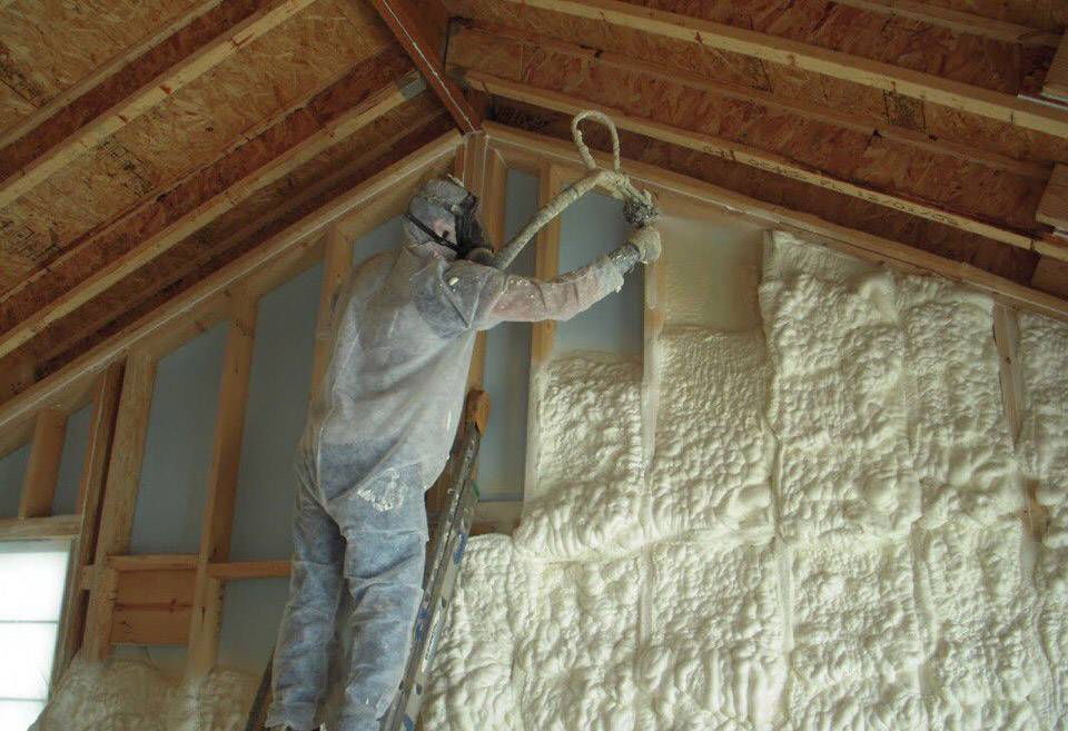 Нанесение пенополиурнтана на стены.