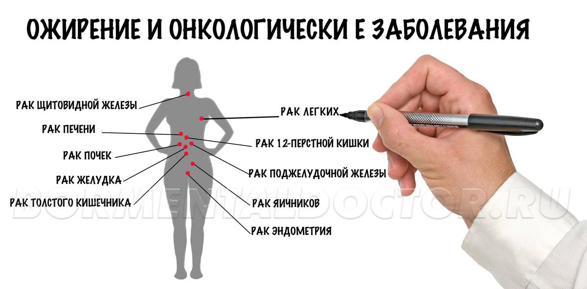 Раковые заболевания в 40% случаев связаны с ожирением. Мало того, что ожирение провоцирует диабет, который служит фактором риска злокачественных новообразований — оно и само по себе способствует развитию определённых видов рака. Научные исследования показывают, что не в меру разросшаяся жировая ткань выделяет избыточные гормоны и прочие вещества, которые запускают процесс перерождения здоровых клеток в раковые и их патологическое деление. На прицеле онкологии оказываются следующие органы: