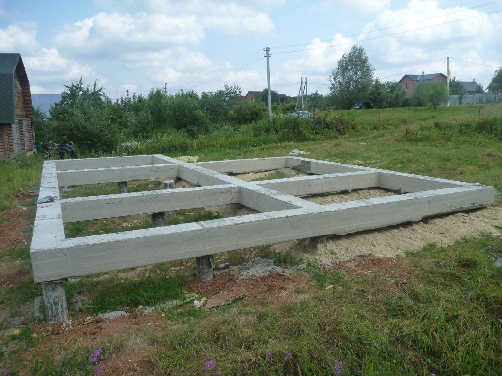 В готовую свежину заводят армокаркас, после чего конструкцию заливают бетонным раствором. После затвердевания опоры переходят к строительству железобетонного ростверка в виде монолитной ленты традиционным способом. При этом между нижней плоскостью ростверка и поверхностью земли должен оставаться зазор в 30–45 см.