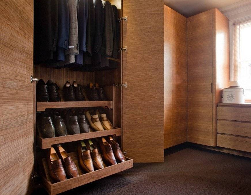 Над обувницей рационально расположить открытые полки для хранения сумок, ремней, перчаток. Тут же помещают ящики для постельного белья. Поместить ячейки можно вдоль одной стены или по периметру гардеробной.