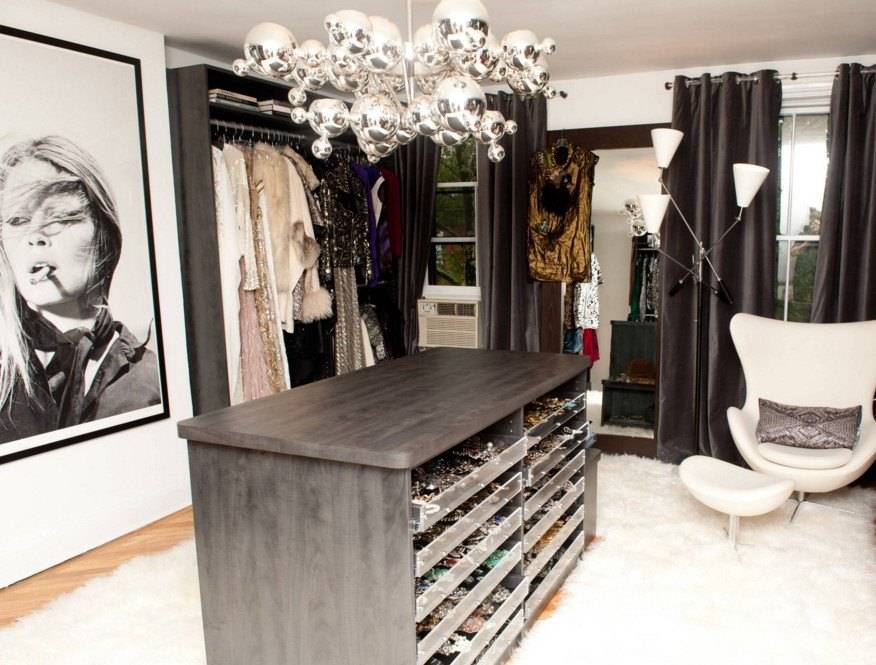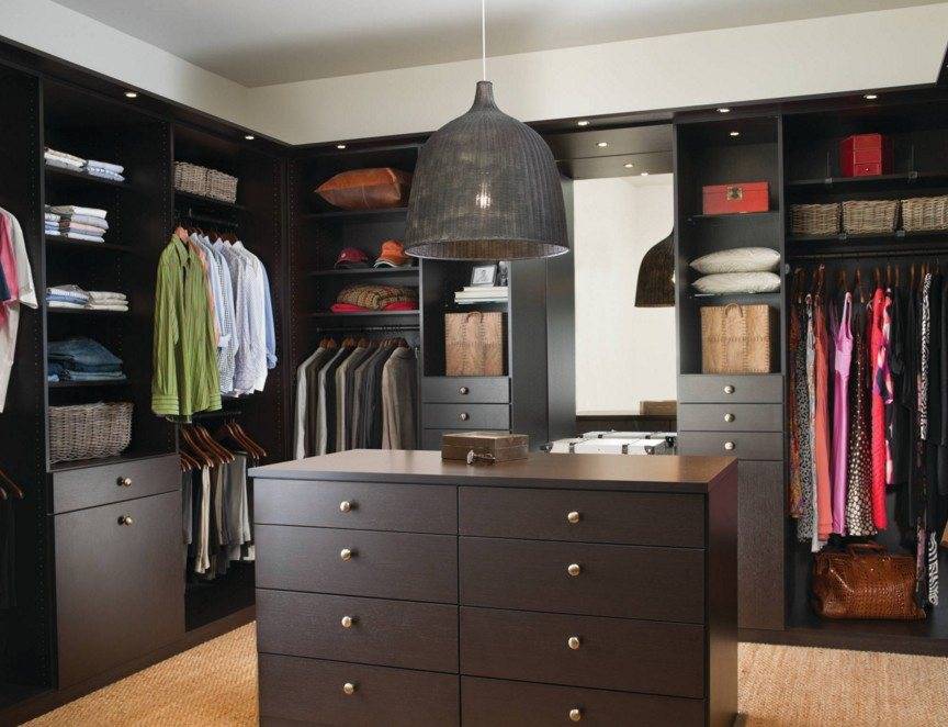 Комнату можно при желании поделить на мужской, женский, детский отделы. В результате подобного решения будет легко и просто найти нужный предмет гардероба за короткое время.