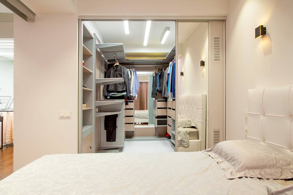 - Отводится территория спальной и закрывается гипсокартонным листом, таким образом, разделяя помещение на две части. Заранее проводится освещение и вентиляция. После устанавливаются стеллажи, штанги и ящики по вкусу владельца квартиры.