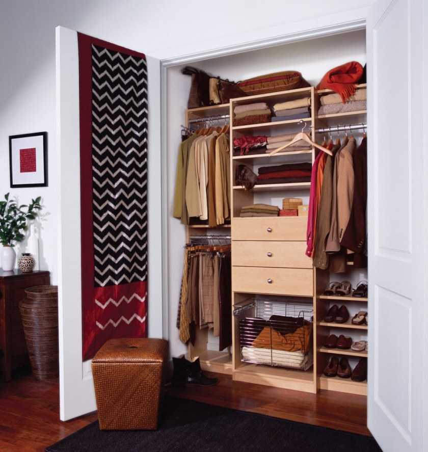 На подобной маленькой части пространства можно поместить лишь несколько полок, где, например, будет храниться одежда. Для белья следует дополнительно оборудовать полочки.