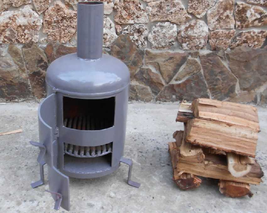 Для изготовления дымохода используют трубу из металла толщиной 3 мм, имеющую сечение как минимум 12 см. Топочная камера вырезается из выбранной заготовки. Решетка для топлива устанавливается на дне, а под ней – ящик для сбора золы из металла толщиной 3 мм. Камеру закрывают сверху и выводят дымоход. Ножки для печки изготавливают из металлических уголков.