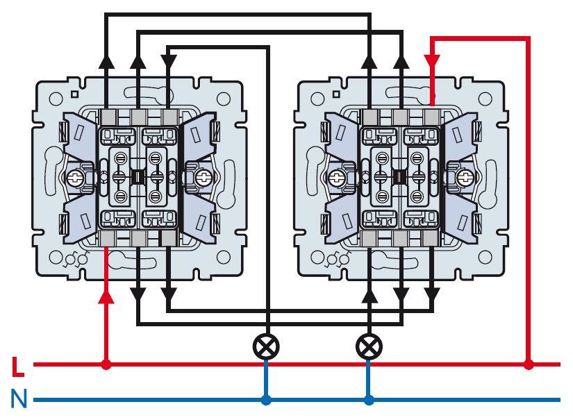 У двухклавишного выключателя 4 контакта. На рисунках хорошо видно, как управлять источником освещения при помощи проходных выключателей из 3 разных мест. На колодке специальными обозначениями показано, какой контакт чему соответствует