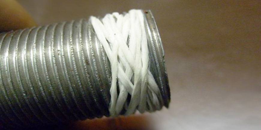 2) Герметизация резьбы подмоткой «Рекорд» Работать с нитью «Рекорд» тоже максимально просто. Её можно применять на мокрой, ржавой, частично разрушенной резьбе без предварительной подготовки самой резьбы.