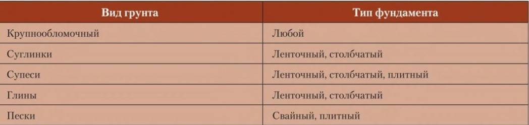 В таблице показаны рекомендации по выбору конструкции фундамента в зависимости от типа грунта. Уточним, что на крупном, гравелистом песке можно ставить любой, а на мелком — указанные в таблице виды.