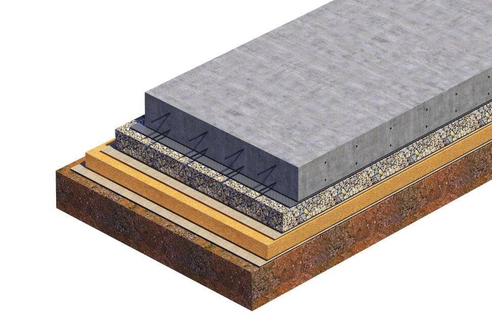 - В завершение укладывают пленку из полиэтилена (200 мкм) и покрывают ее стяжкой из бетона или цемента. Это делается для того, чтобы предотвратить проникновение бетона в геотекстиль и уменьшить шанс повреждения гидроизоляции во время сезонных подвижек грунта.