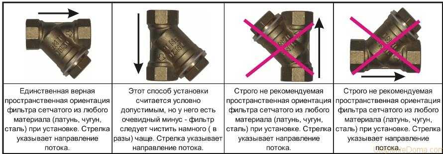 На корпусе обязательно указывается стрелкой правильное направление потока фильтрующейся жидкости. Скошенная часть всегда смотрит вперед по направлению потока.