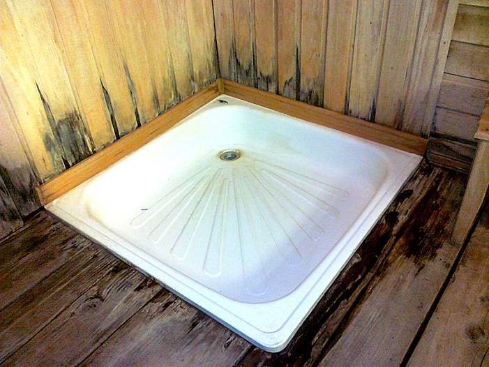 - Затем обследовать душевую, в частности, пространство возле поддона. Если запах здесь особенно силен, то нужно снимать поддон: скорее всего, грибок живет под ним.