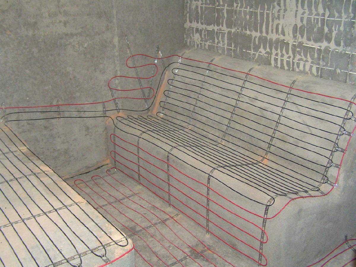 На следующем этапе устанавливают обогрев пола и лежаков. Подогрев может быть электрический или водяной. После установки монтажа «теплого пола» его подключают к уже подведенным кабелям или водопроводному стояку. Имеющиеся полости устраняют при помощи адгезионной штукатурки и, после ее высыхания, приступают к следующему этапу.