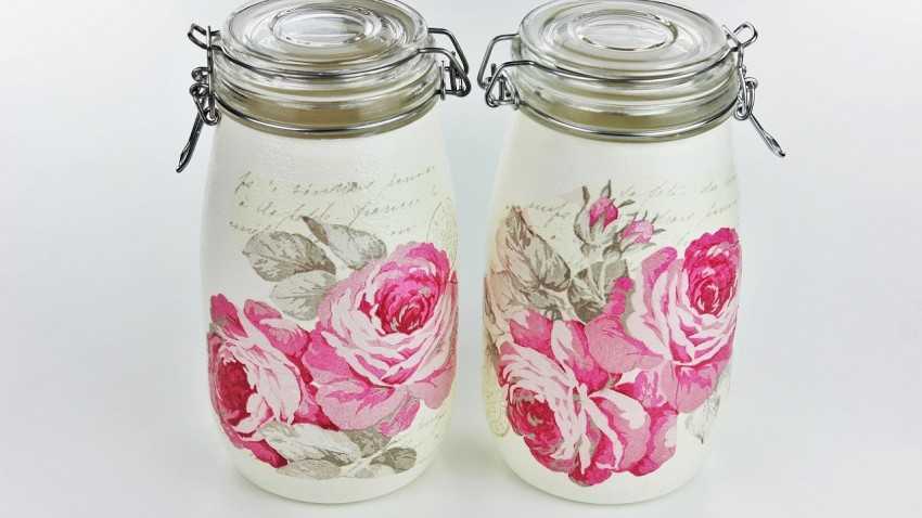 В едином стиле можно выполнить декупаж банок из-под кофе для хранения чая, сыпучих продуктов или специй: они придадут особый колорит вашей кухне.