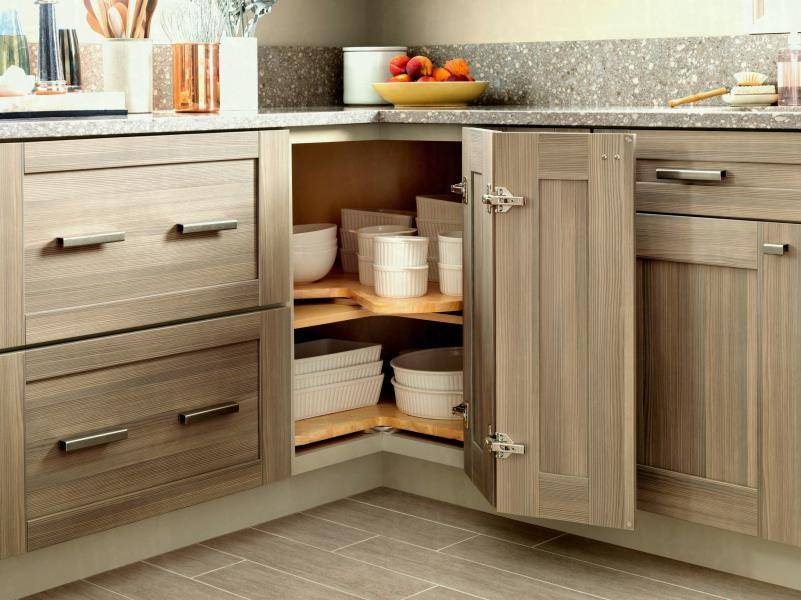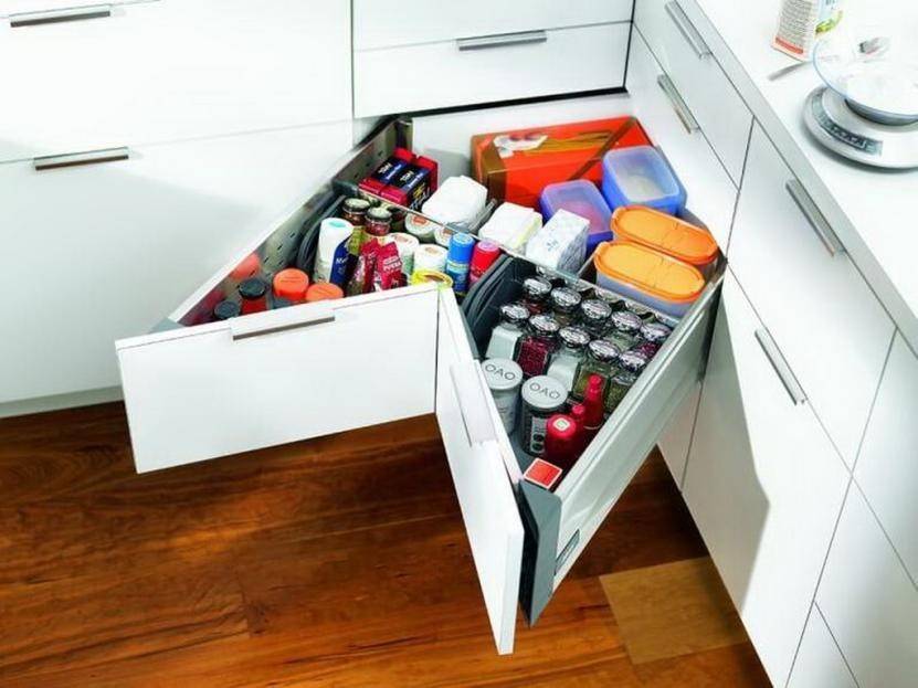 Угловые шкафы также являются хорошим местом для хранения большого оборудования и посуды. При условии, однако, что и здесь вы позаботитесь о сборке выкатных систем