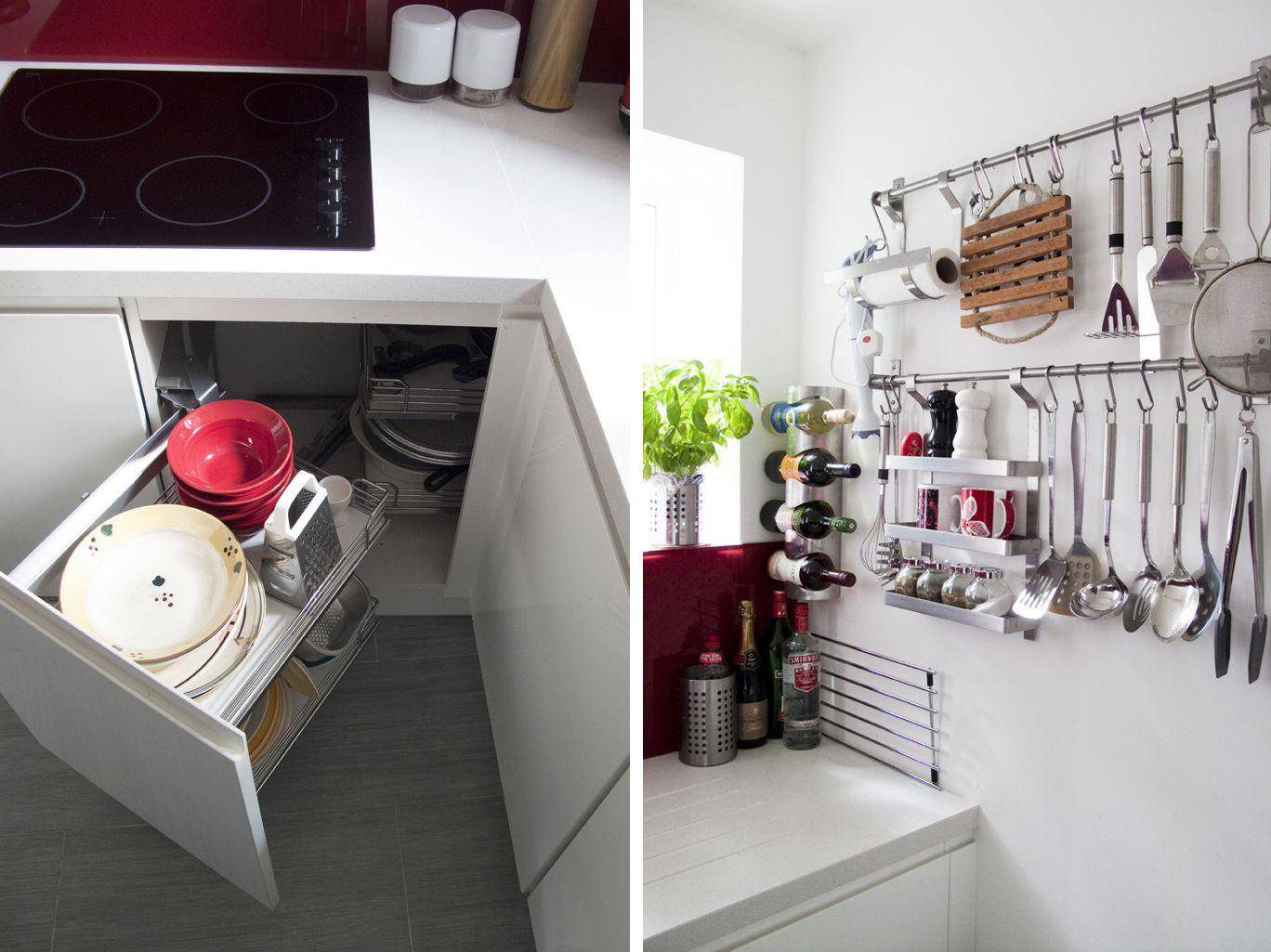 - Различные приспособления в виде крышек и сковородок, шумовок и лопаток лучше всего разместить на модульных или подвесных конструкциях.