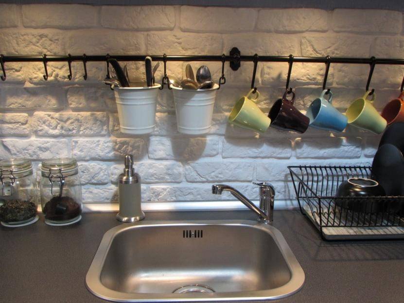 В случае необходимости составления проекта для скромного по размерам помещения дизайнеры предлагают весьма оригинальные решения. К примеру, фартук над столешницей можно заменить плитой с перфорацией, сделанной из ДСП. По периметру панели проделываются отверстия, в них монтируются рейлинки и держатели для размещения стаканов под столовые приборы, наборов ножей, чистящих средств.