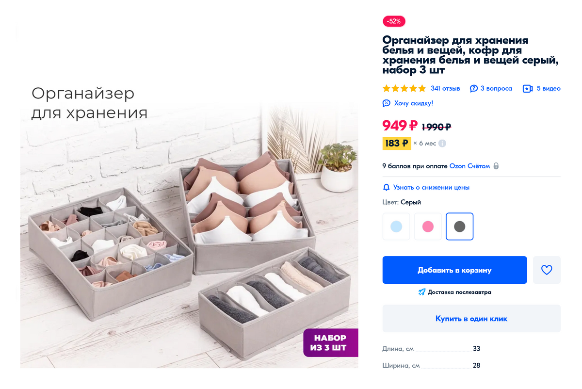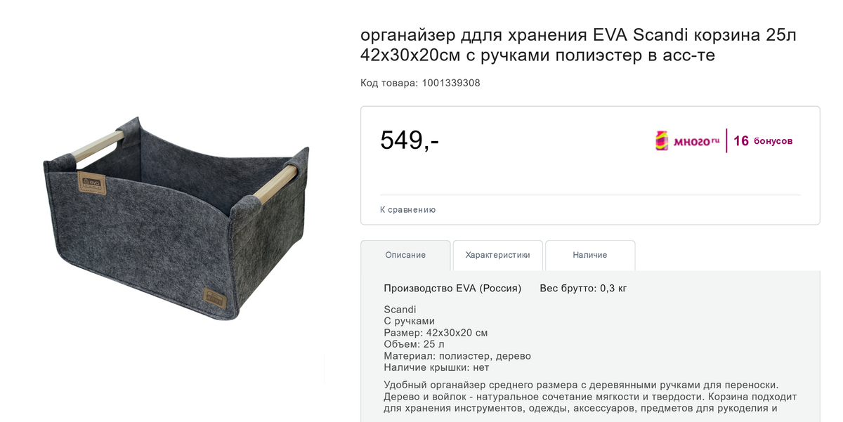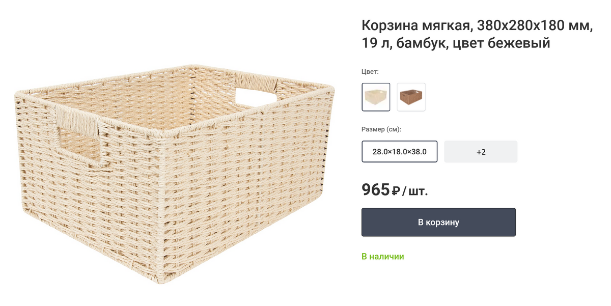 Я изучила сайты разных магазинов и подобрала несколько вариантов: корзины из морской травы, ротанга, бамбука, органайзеры из войлока и обычные коробки из гофрокартона. Цена за набор, который поместится на двух полках, варьировалась от 790 Р до 19 996 Р.