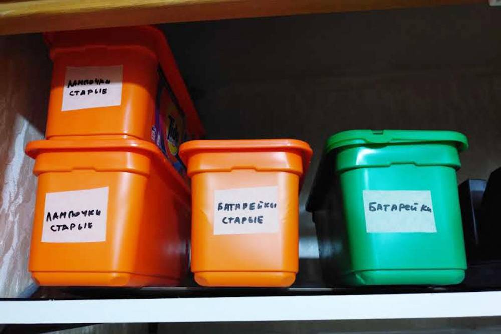 Так мы храним использованные и новые батарейки и лампочки. Использованные копим, а потом утилизируем