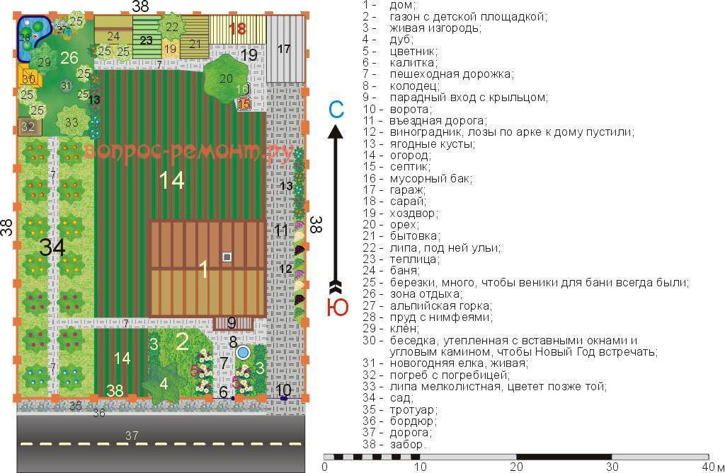Взгляните на рис. Сколько там всего! Рай земной, да и только, а не усадьба. Теперь возьмите масштаб: стандартные 12 соток и дом 120 квадратов в плане, 80 жилых. Обзаведясь землей, всю зиму ругались – с чего начинать, где чему быть. Семья по доходам средненькая; обстроиться за свои никак не выходило без продаж будущей сельхозпродукции. Предполагалось, что года 3 на участке из строений будет только сарай, поэтому строить его нужно было дешево, но капитально. Гараж отодвигали в дальний угол и смету на дорогу к нему сбивали скрепя сердце, но иначе никак не выходило уложить в санитарные нормы помойку с выгребом, обеспечив к тому же подъезд мусоровоза к баку и санбочки к септику.
