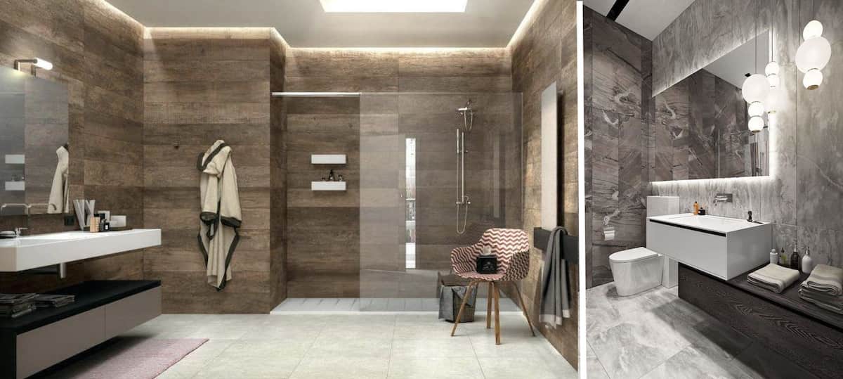 Такой вид облицовки стен – универсальный вариант аккуратного и недорогого способа защиты вертикальных поверхностей ванной или душевой от влаги. Он прекрасно сочетается с другими видами отделки и трансформируется практически в любую стилистику помещения.