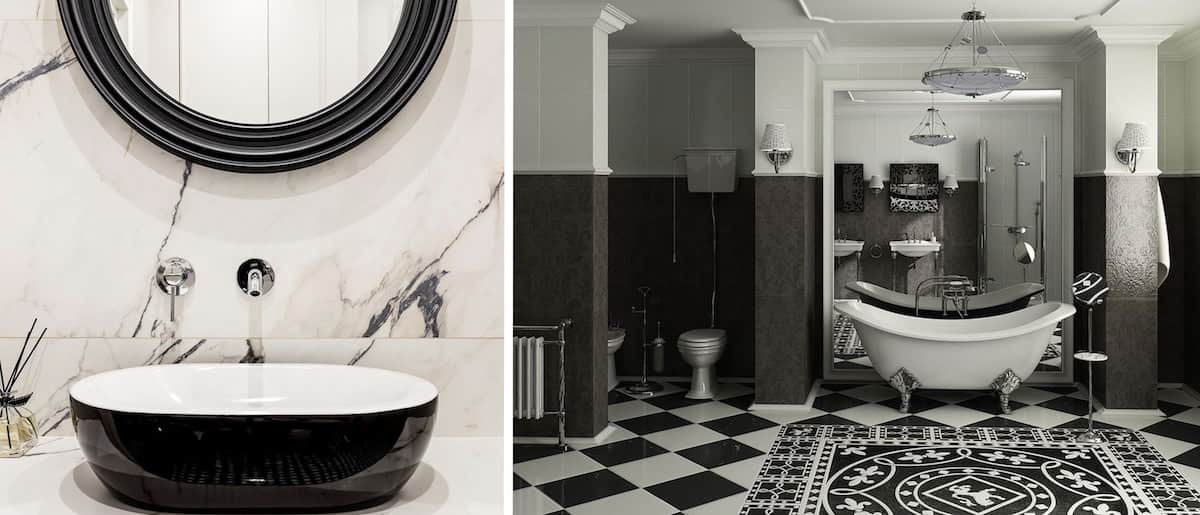 Вполне естественно, что вершину первенства в интерьере уборной занимает ванна. Шикарно в черно-белой ванной с окрашенными стенами будет выглядеть свободностоящая ванна на лапах. Узорчатые накладки под черненный метал или серебро вместе с белоснежной чашей очень гармонично подчеркнут общую задумку.