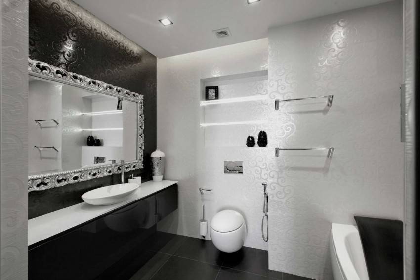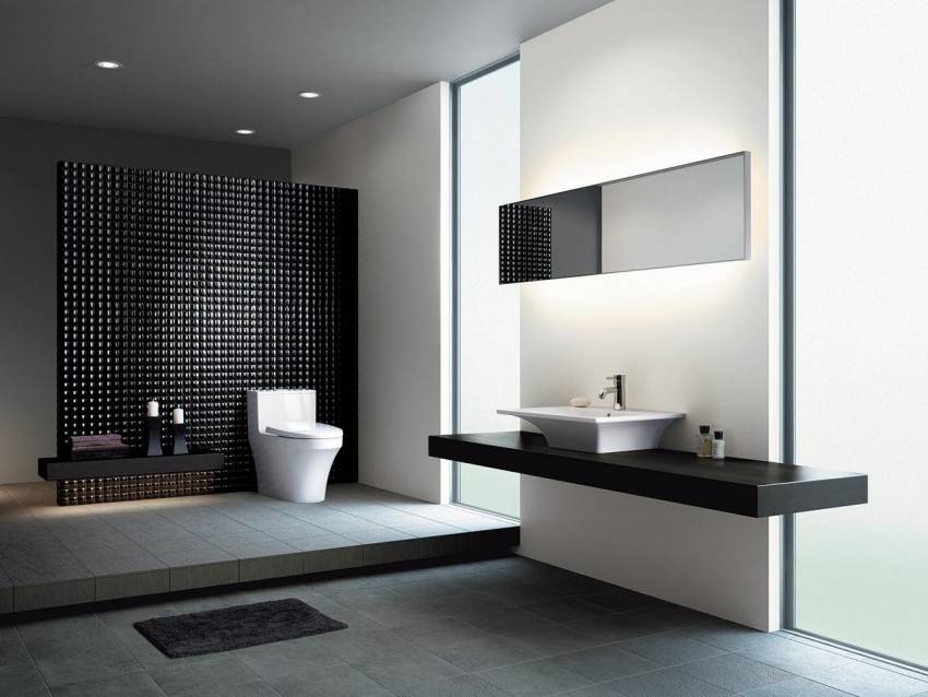 Для маленькой ванной – это не лучшее решение, если будет много черного цвета. Такое тяжелое оформление будет давить на психику и сковывать. Если сделать основным цветом – белый, то комната визуально расшириться, а уже для окантовки можно использовать черный.