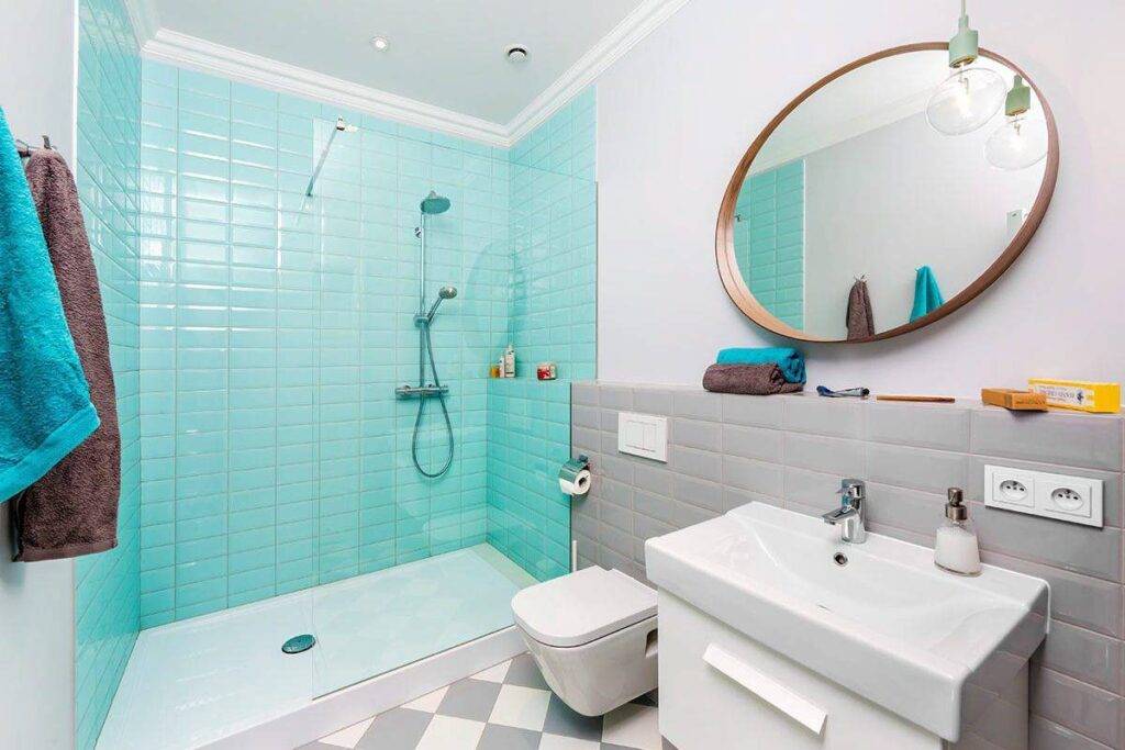 Мебель выбирайте светлую. Хорошо будут смотреться изображения растений на кафельных плитках. Бирюзовый цвет сейчас на пике популярности, и он считается классическим для оформления ванной в зеленых оттенках.