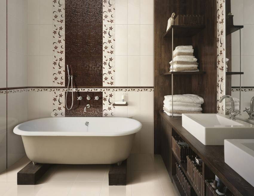 Лидер среди коричневых – оттенок «кофе с молоком». Он может погрузить человека в свои мысли, когда тот принимает расслабляющую ванну, а сам цвет сочетается со многими другими цветами. Древесные же оттенки – более привычны для человеческого глаза, и есть такие плитки для стен в ванной, которые имитируют деревянную поверхность.