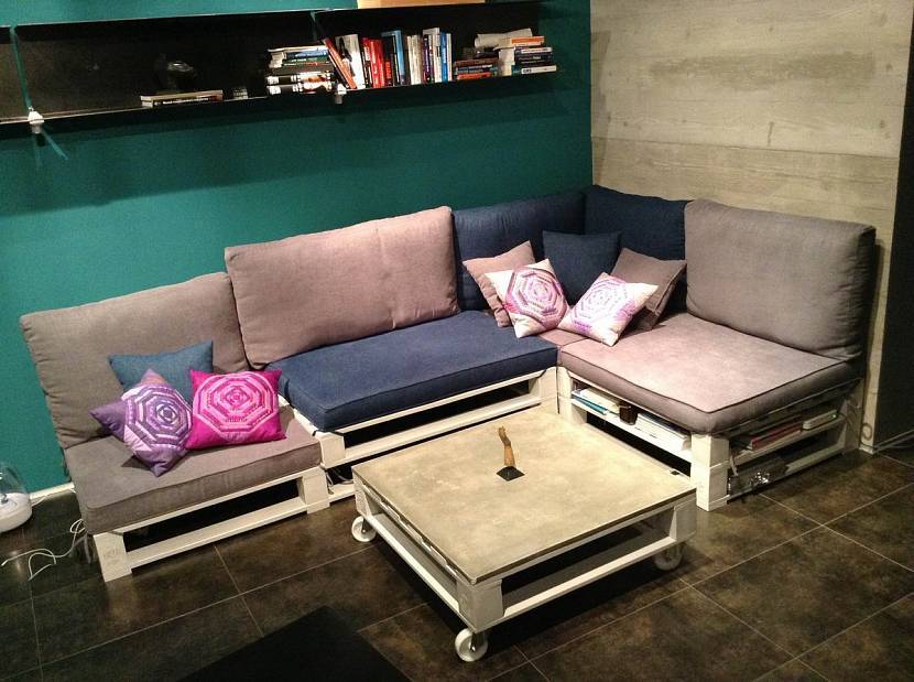 Вероятно, это одна из самых бюджетных идей создать свой собственный диван. Вы можете просто поставить паллеты друг на друга, закрепить между собой с помощью саморезов, прикрутить спинку, из тех же поддонов, и разместить подушки. По желанию — установить колесики или предать цвет вашей конструкции.