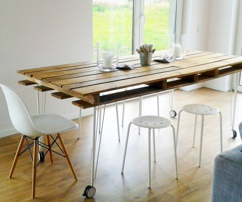 Для высокого обеденного стола понадобятся дополнительные бруски или специальные ножки. Обеденный стол больше всего подвержен износу — его часто протирают, случайно проливают на него напитки, пачкают едой. Поэтому его точно нужно отшлифовать и покрасить или положить сверху защитное стекло.