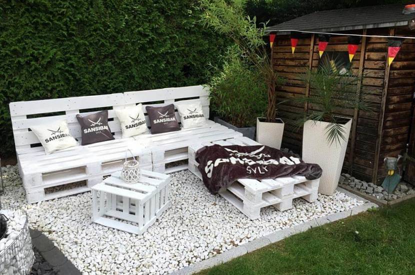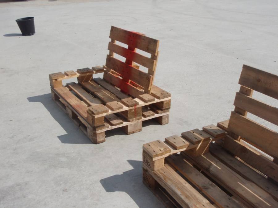Зону отдыха на даче многие обустраивают шезлонгами: готовые продаются в магазине в ассортименте, но при наличии ненужных поддонов можно все сделать своими руками. Для обустройства одного шезлонга понадобится 3 паллета: два одинаковых и один чуть шире. Первые два кладут друг на друга и приступают к разбору третьего поддона, который будет служить спинкой. Из него уделяют все нижние доски, а также бруски сзади и спереди паллета, и половину досок из верхнего ряда, все работы проводят аккуратно, ведь отходы этого этапа еще пригодятся.