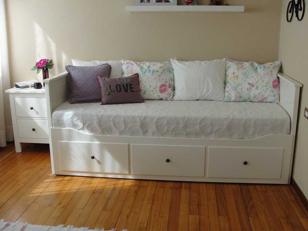 Кушетка «Хемнэс» ‑ еще один неплохой вариант, который может послужить кроватью в случае необходимости. Она также оборудована двумя ящиками для хранения. В обычное время кушетку лучше дополнить подушками, чтоб компенсировать отсутствие спинки и частично закрыть широкое сиденье.